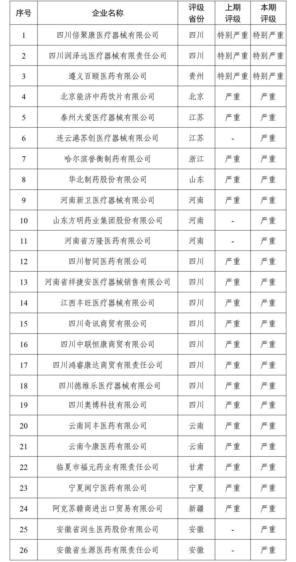 据新华社,国家医保局医药价格和招标采购指导中心11月20日发布了各省份评级为“特别严重”和“严重”失信的26家医药企业情况,其中23家医药企业评级为“严重”,3家医药企业评级为“特别严重”。根据信用评价目录清单,医药商业贿赂、涉税违法、实施垄断行为、不正当价格行为、扰乱集中采购秩序、恶意违反合同约定等有悖诚实信用的行为被纳入医药价格和招采信用评价范围。