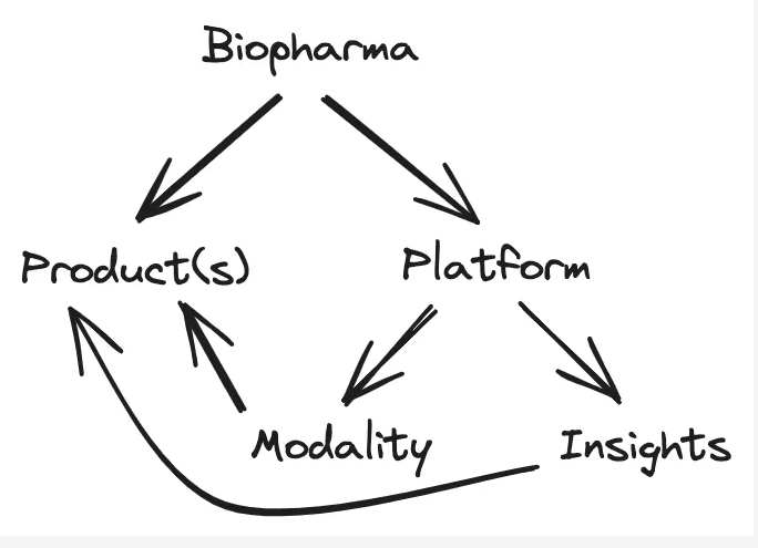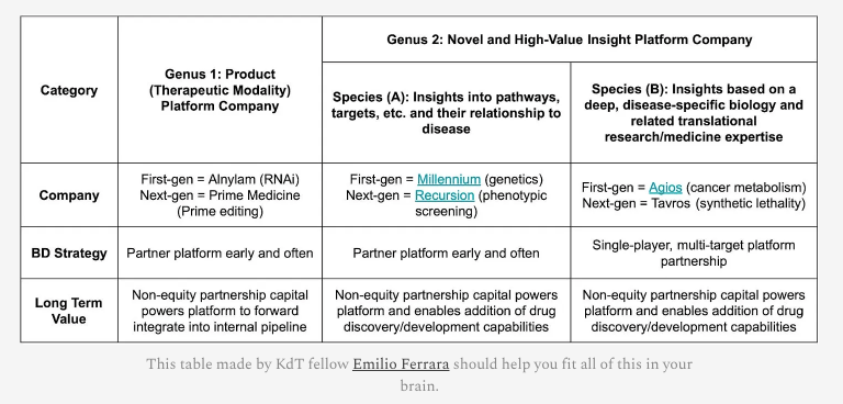 值得庆幸的是,他又向前迈进了一步。他在一篇充满历史和运营见解、“哲学思考”( 得益于他之前作为牛津哲学博士的生活 )以及战略思想的史诗般的博客文章中分享了他对生物技术平台公司的“分类学”( “typology” of biotech platforms ),以及与几位生物技术行业杰出人物关于提出的框架的对话。这篇文章的核心观点如下: