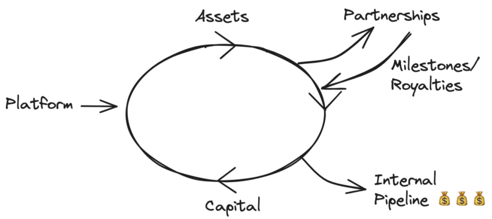 鉴于这种潜在的 "财富的尴尬",新(药物/治疗)模式平台( new modality platforms )在融资方面的战略考虑与纯产品型公司不同。从理论上讲,公司的未来价值分布在所有潜在资产上。这使得早期合作即使条件较差,也更具吸引力。其逻辑是 "当然,让我们在第一个项目上合作吧,还有更多的项目等着我们"。