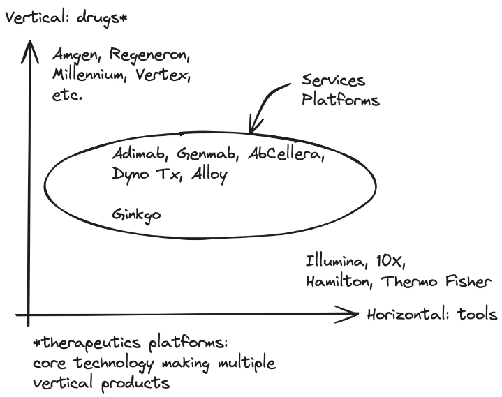 在整个生物技术领域,历史上对内部开发药物的垂直专注( a vertical focus on internally developed drugs )一直是最成功的价值创造战略。虽然将新药物推向临床并非易事,但对患者、发明者和投资者的潜在回报是巨大的。这种策略行之有效。然而,服务/基础设施公司通常没有得到应有的赞誉。其中一些公司已经重塑了整个科学领域并取得了巨大的财务成功。