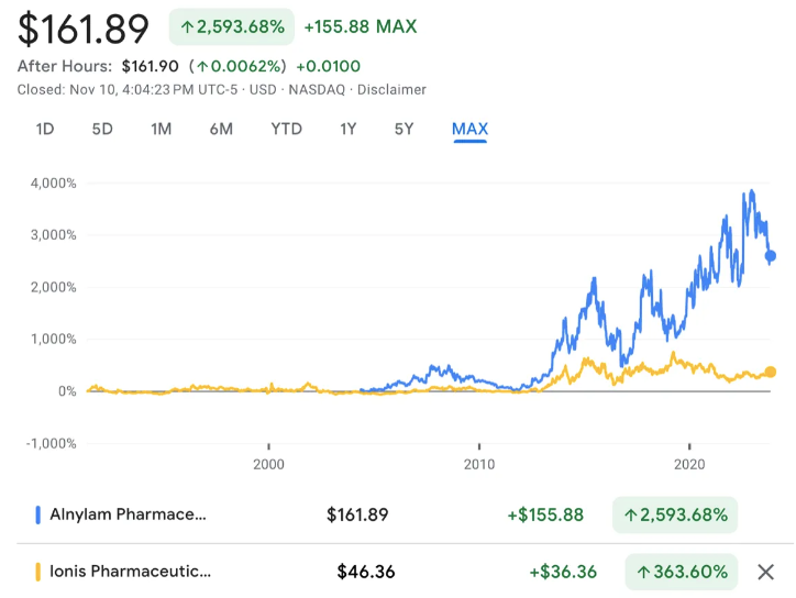 正如 John Maraganore 在回应 Holtzman 时指出的那样,Ionis 和 Alnylam( RNA干扰领域的另一家领军公司,采取了更垂直的产品为中心的方法 )的相对估值和股价反映出,即使是最成功的服务平台也 “让大量价值流失”。虽然 Ionis 已经扩展到追求他们完全自有的临床项目,Alnylam 在较早时期就这样做了,这在一定程度上解释了下面公司规模的差异,尽管两者都专注于非常相似的技术。