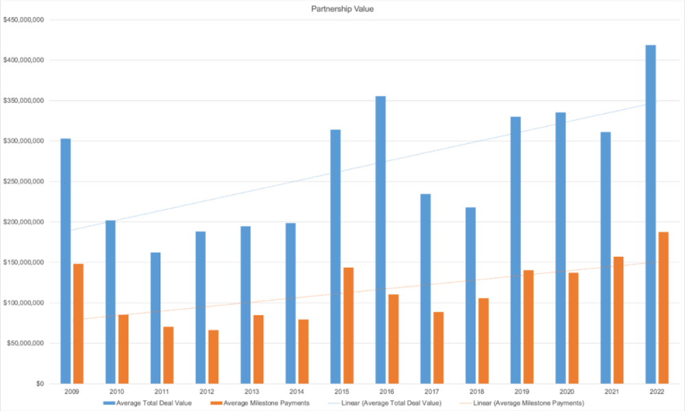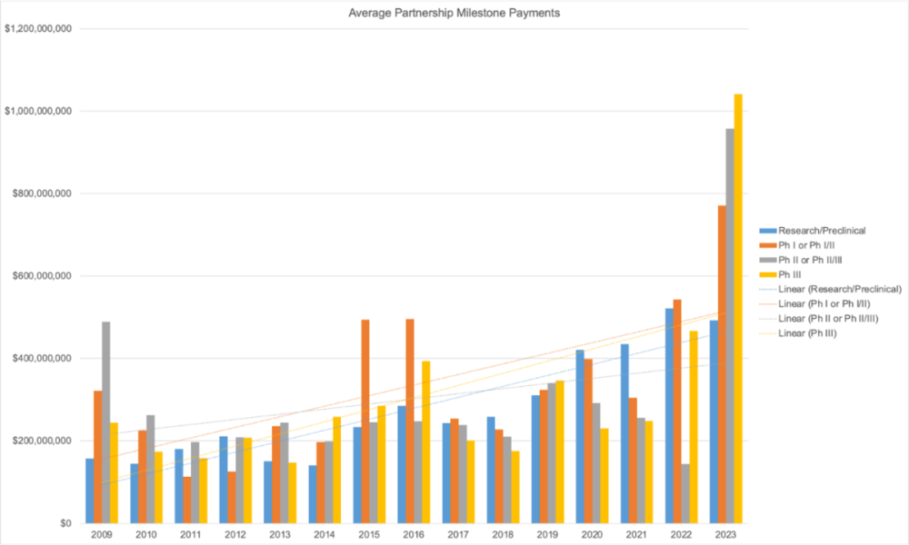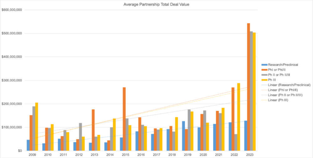 然而,作为早期投资者,我们必须不断挑战行业教条。在历史上,生物技术领域以合作为中心的模式( partnership-centric models )一直难以扩展,但这在未来是否仍然成立?我们采取了数据驱动的方法来研究这个问题,并分析了 BioCentury 数据库中 2009 年至 2023 年披露条款的所有生物制药合作伙伴关系,总共超过 2000 个合作伙伴关系,涵盖所有开发阶段。我们的逻辑是:如果平台技术( 例如AI、新型给药递送模式等 )变得更加成熟和有效,生物技术公司不断为制药合作伙伴提供价值,那么合作伙伴关系的平均交易价值应该会随着时间的推移而增加。