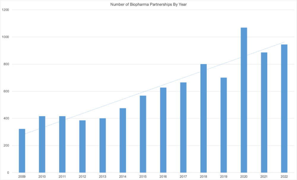 最后,我们观察到每年生物制药合作伙伴关系数量呈正向趋势,有效地扩大了服务平台的总体可用市场规模(TAM),这是总交易数和每笔交易各自价值的乘积。