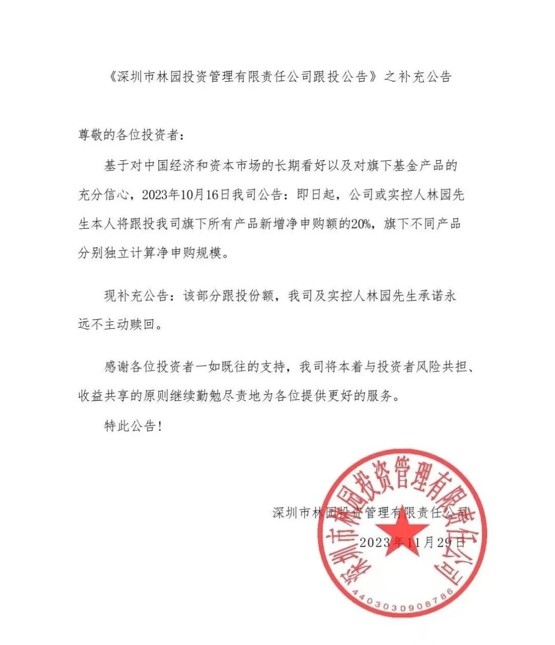 据蓝鲸财经,就此前公告表态将跟投旗下所有产品新增份净申购份额的20%后,林园投资11月29日补充公告称,针对此前跟投份额补充承诺,永远不主动赎回。早在今年10月16日,该公司公告称,基于对中国经济和资本市场的长期看好以及对旗下基金产品的充分信心,当天起,林园投资或实控人林园本人将跟投该司旗下所有产品新增净申购额的20%,直至取消跟投公告发布之日终止。