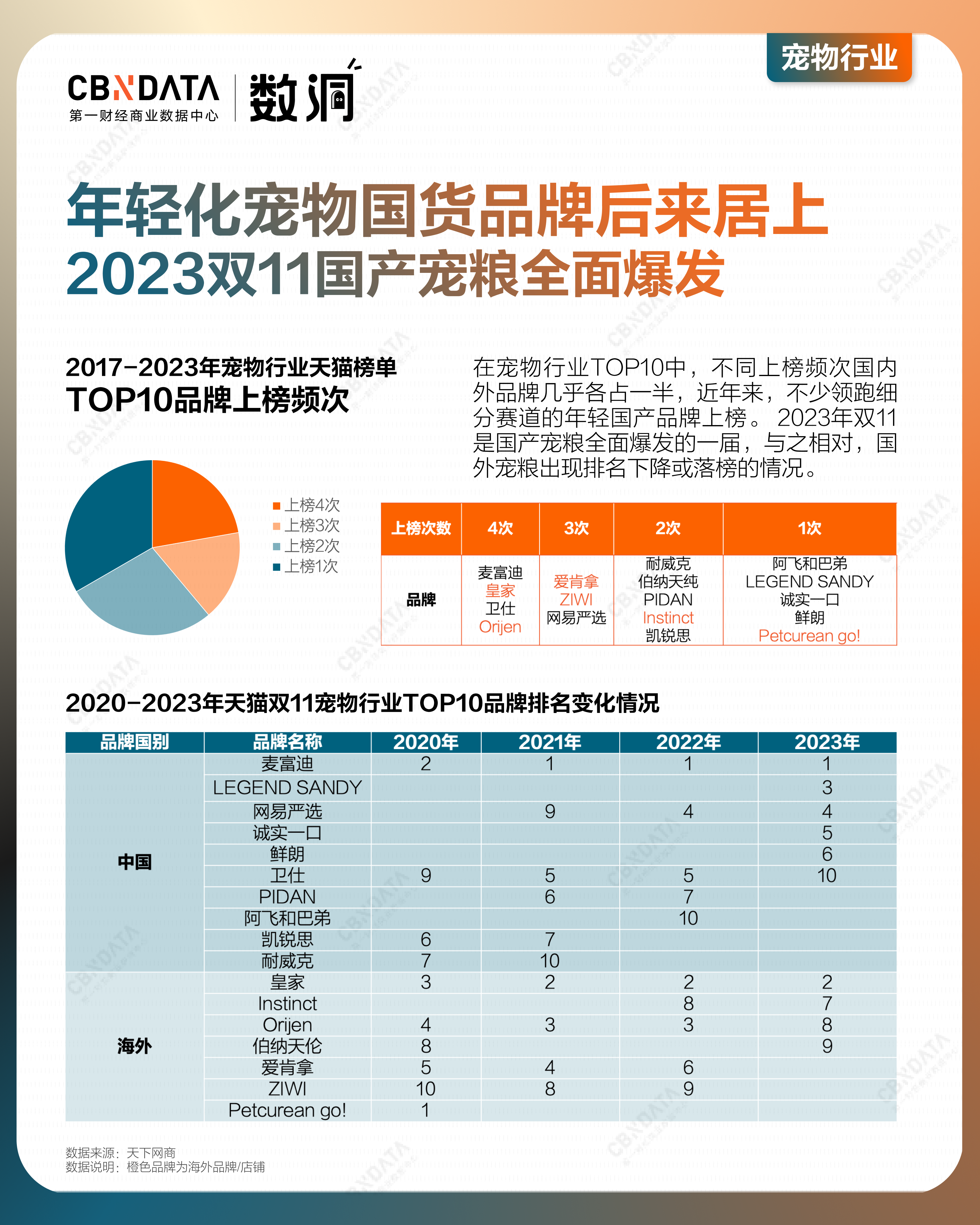 在宠物行业TOP10中,不同上榜频次国内外品牌几乎均各占一半。随着细分赛道的崛起,不少领跑细分赛道的年轻国产品牌上榜。