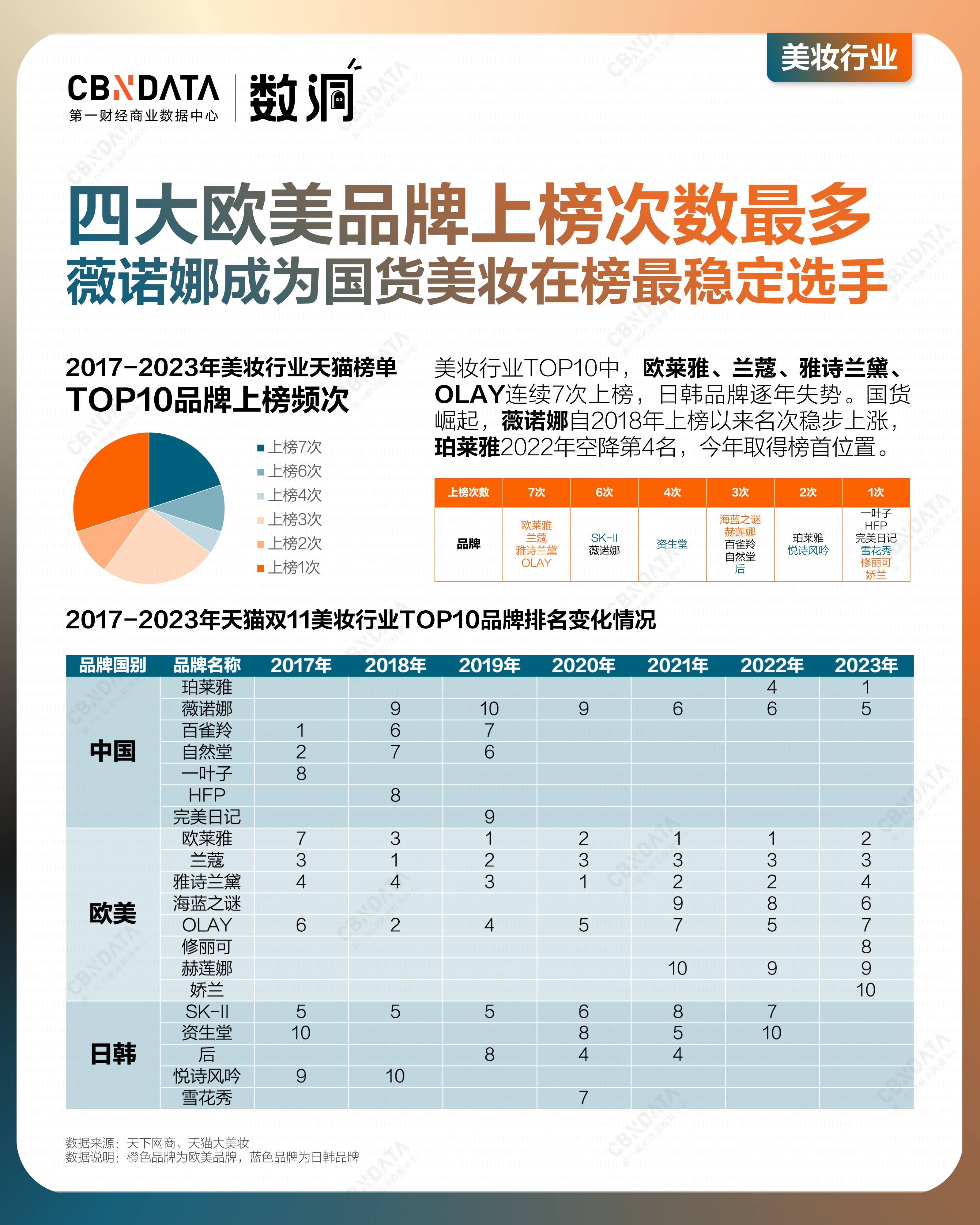 4️⃣ 美妆:国际品牌上榜次数最多,薇诺娜成为国货美妆在榜最稳定选手(图4)