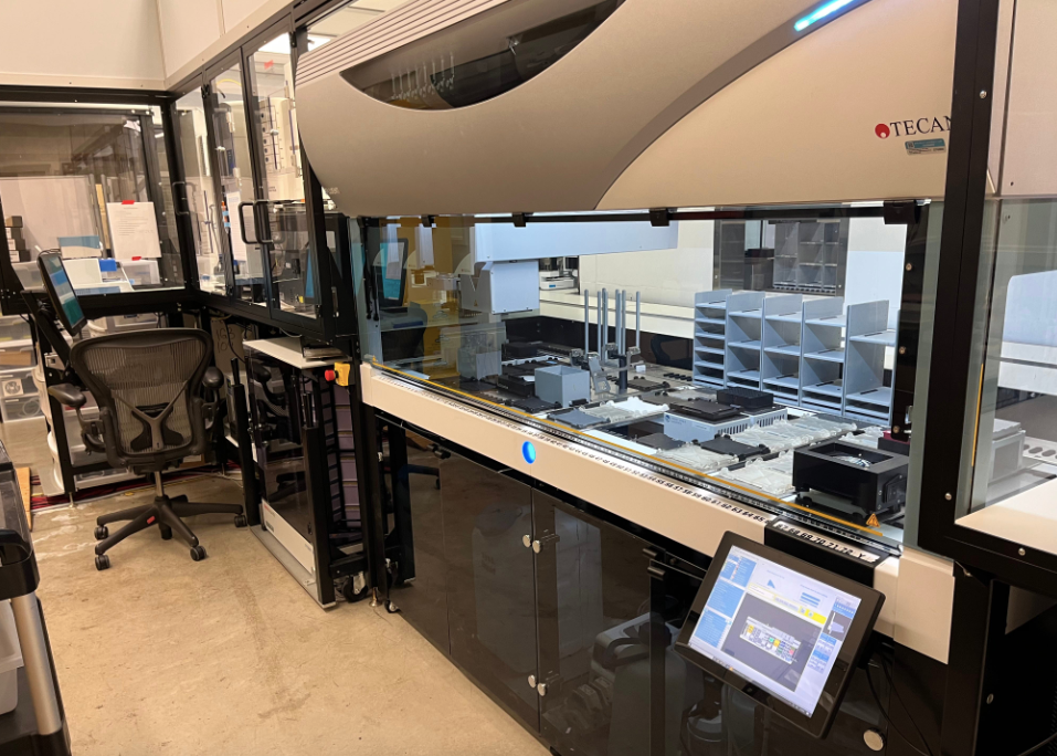 伊利诺伊大学香槟分校的生物铸造实验室( biofoundry )有三个液体处理机器人。照片由尼科-麦卡蒂 ( Niko McCarty ) 拍摄。