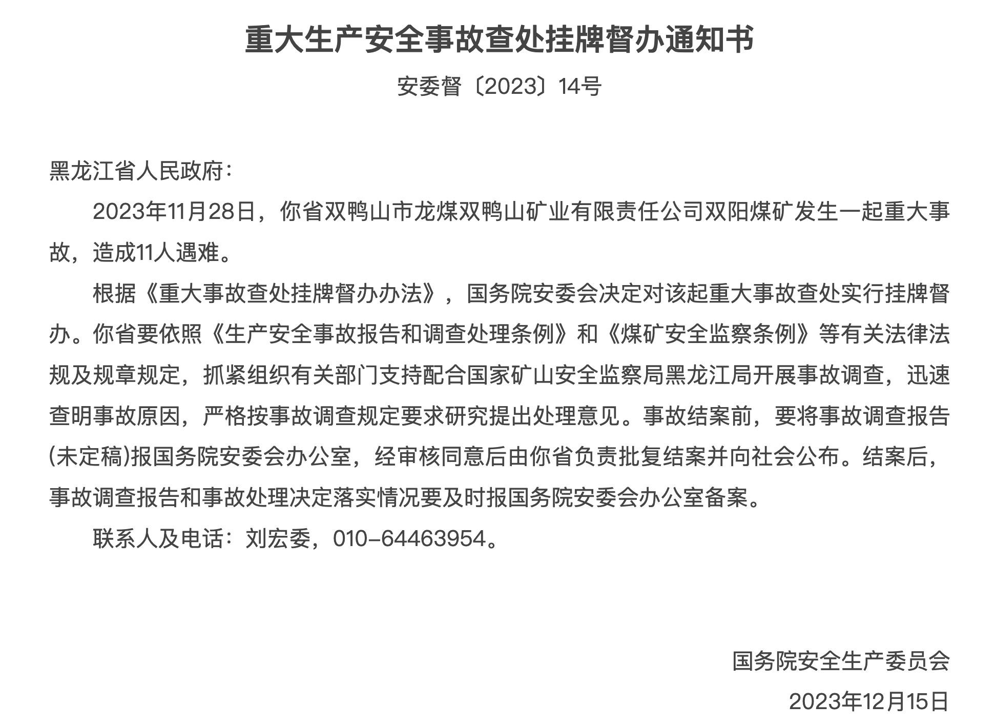 据应急管理部消息,2023年11月28日,黑龙江省双鸭山市龙煤双鸭山矿业有限责任公司双阳煤矿发生一起重大事故,造成11人遇难。国务院安委会决定对该起重大事故查处实行挂牌督办。