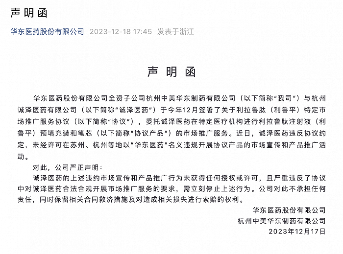 12月18日,华东医药股份有限公司微信公众号发布声明函称,全资子公司杭州中美华东制药有限公司与杭州诚泽医药有限公司于今年12月签署了关于利拉鲁肽(利鲁平)特定市场推广服务协议,委托诚泽医药在特定医疗机构进行利拉鲁肽注射液(利鲁平)预填充装和笔芯(以下简称“协议产品”)的市场推广服务。近日,诚泽医药违反协议约定,未经许可在苏州、杭州等地以“华东医药”名义违规开展协议产品的市场宣传和产品推广活动。
