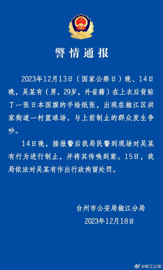 据浙江台州市公安局椒江区分局官方微博消息,台州市公安局椒江区分局18日发布警情通报,12月13日(国家公祭日)晚、14日晚,吴某有(男,29岁,外省籍)在上衣后背贴了一张日本国旗的手绘纸张,出现在椒江区洪家街道一村篮球场,与上前制止的群众发生争吵。