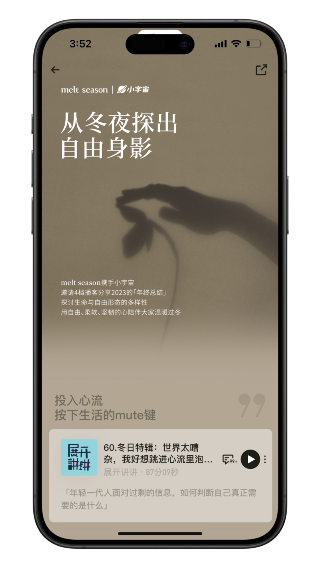 近日,本土高端香水品牌 melt season 联合小宇宙推出「从冬夜探出自由身影」企划。