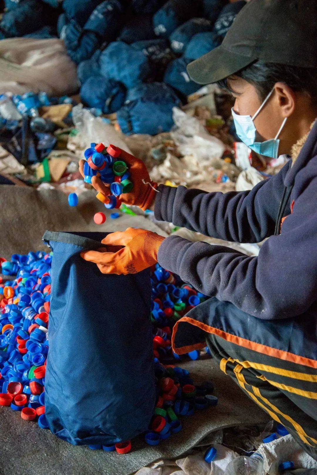在山上的垃圾里,塑料瓶子和易拉罐都有相对高的回收经济价值,而塑料瓶的盖子则少些。
