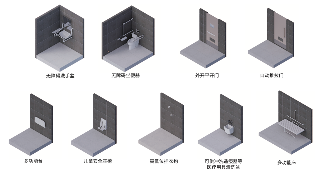 除此以外,无障碍洗手间里还会设置无障碍洗手盘、坐便器、儿童安全座椅、医疗用具清洗盘等等。