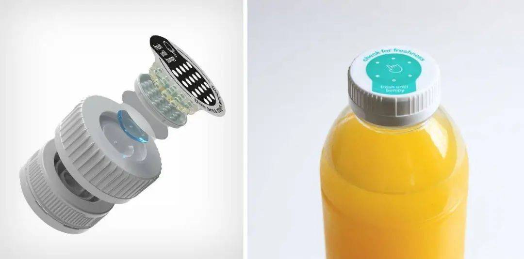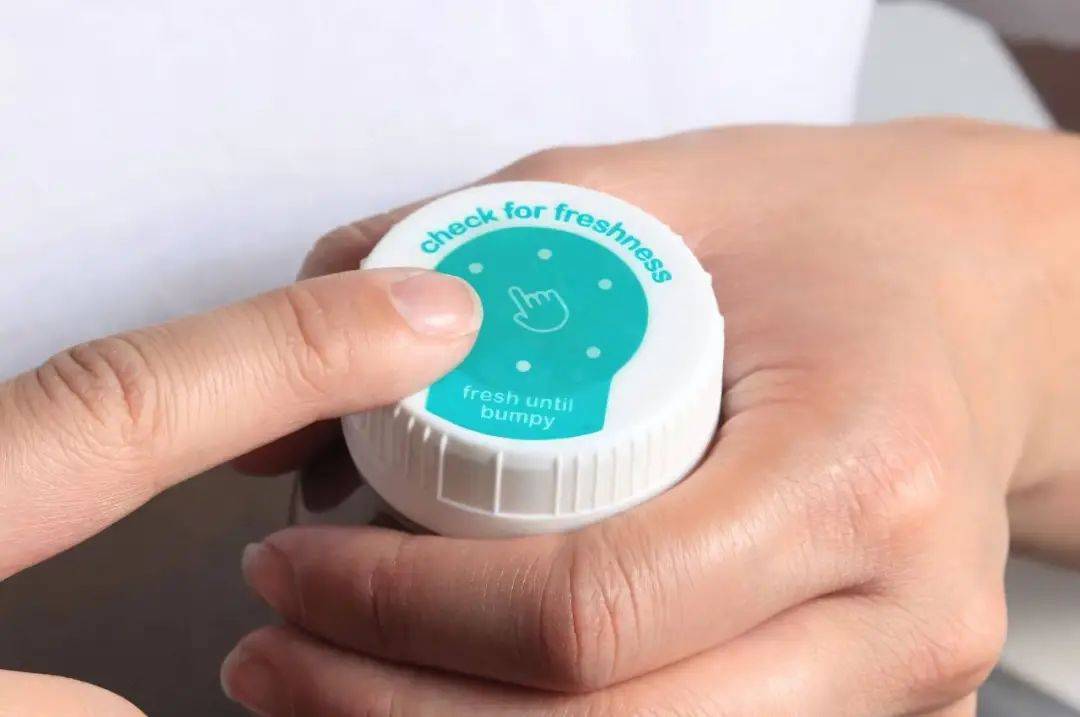 如果瓶子里的东西没有坏,瓶盖不会有改变。但如果里面的东西坏了,用户就能摸到瓶盖上的凝胶膨胀有凸起,减少了手眼判断的必要。