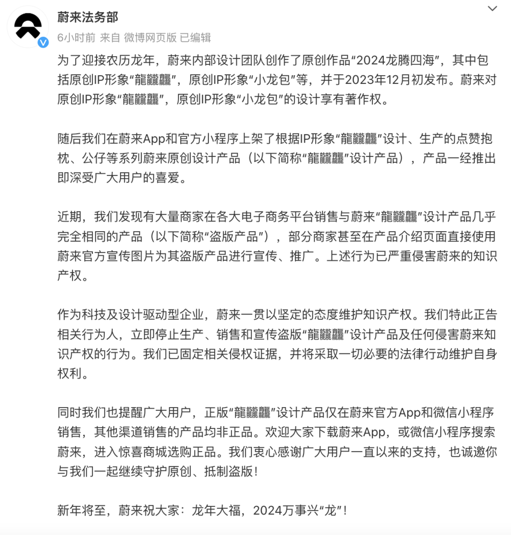1月7日下午,蔚来法务部官微发布声明称,近期发现有大量商家在各大电子商务平台销售与蔚来“龍龖龘”设计产品几乎完全相同的产品,部分商家甚至在产品介绍页面直接使用蔚来官方宣传图片为其盗版产品进行宣传、推广。上述行为已严重侵害蔚来的知识产权。蔚来正告相关行为人,立即停止生产、销售和宣传盗版“龍龖龘”设计产品及任何侵害蔚来知识产权的行为。蔚来表示,公司已固定相关侵权证据,并将采取一切必要的法律行动维护自身权利。正版“龍龖龘”设计产品仅在蔚来官方App和微信小程序销售,其他渠道销售的产品均非正品。