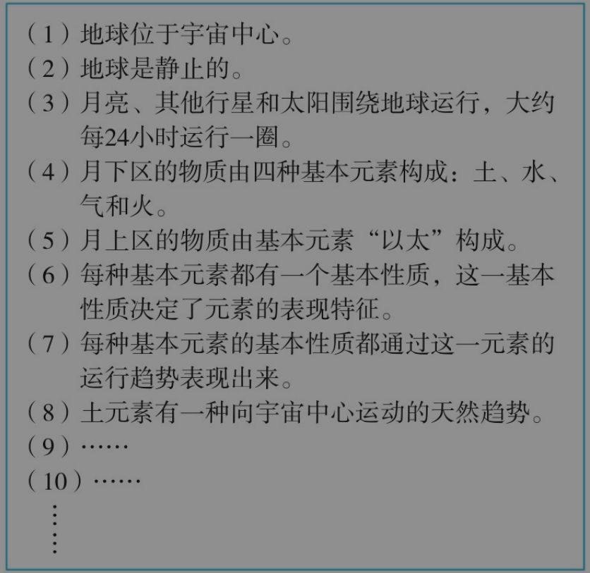 如果要用实例说明亚里士多德的不同观点如何相互拼合,可以拿“地球是宇宙中心”的观点作为例子。这个观点与“土元素有一种向宇宙中心运动的天然趋势”的观点紧密相连,毕竟,地球本身主要由土元素组成。这样一来,“土元素天然地向宇宙中心运动”的观点和“地球本身位于宇宙中心”的观点就完美地拼合在一起了。