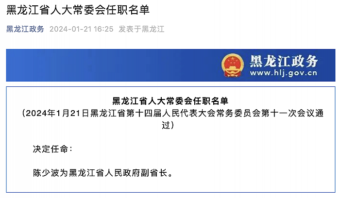 据“黑龙江政务”微信公众号消息,2024年1月21日,黑龙江省第十四届人民代表大会常务委员会第十一次会议通过,决定任命:陈少波为黑龙江省人民政府副省长