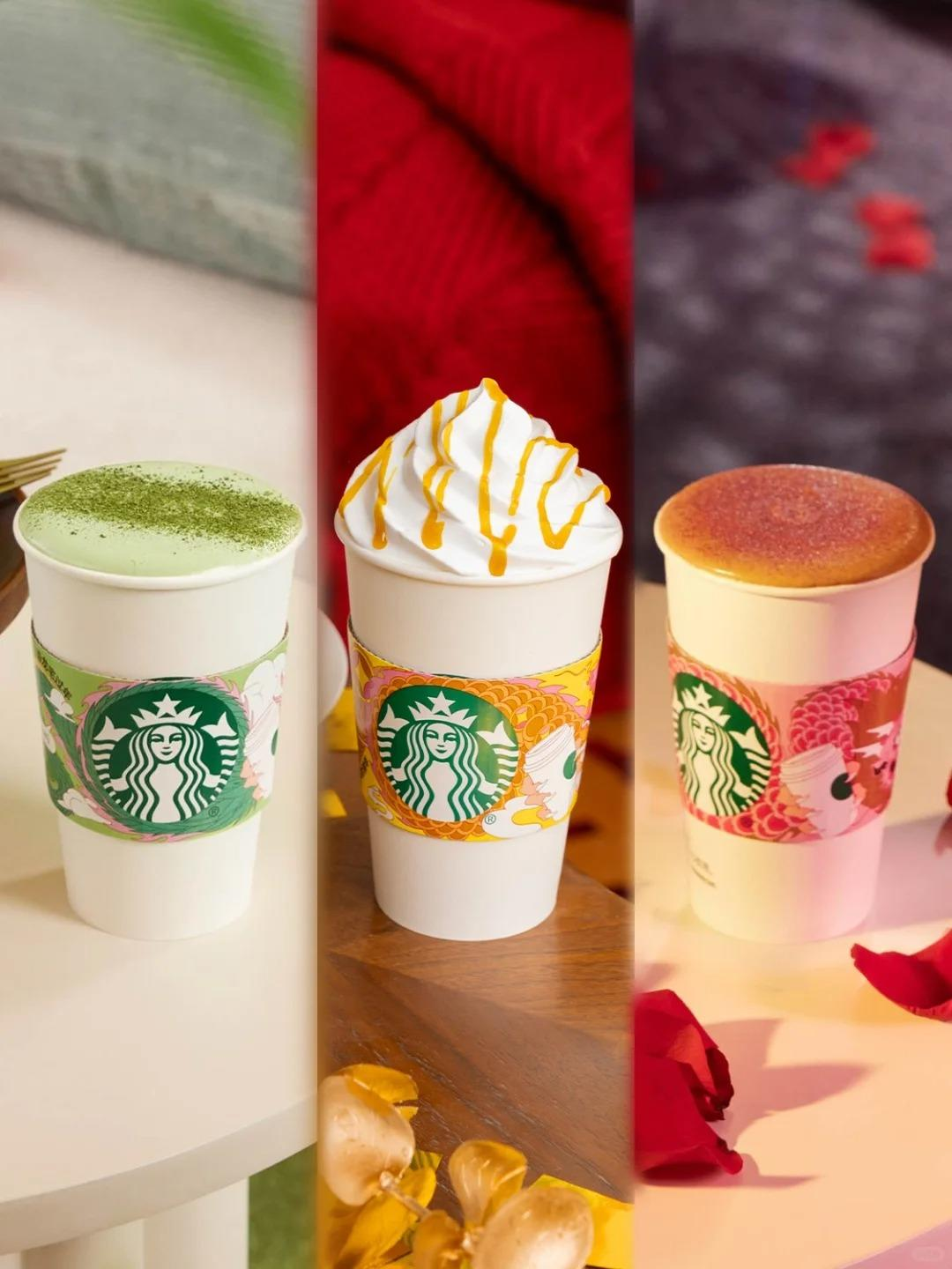 1月23日,星巴克发布龙年新品。咖啡饮品包括三款:黄金焦糖牛乳拿铁、龙井竹乡茶拿铁、重瓣玫瑰馥芮白,此外水杯系列、甜点系列同步上新龙年限定款。(来源:星巴克中国)