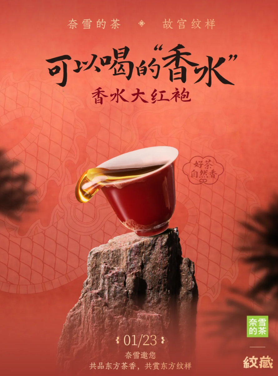 近日,奈雪的茶联名纹藏推出“香水大红袍”系列,将于1月23日正式上线。本次联名共包括两款饮品:“奈雪八香·香水大红袍鲜奶茶”定价19元,“霸气莓果大红袍”定价22元。联名周边有:主题杯、主题杯套、主题保温袋、无纺布袋、联名红包、小盒茶。(来源:奈雪的茶官微)