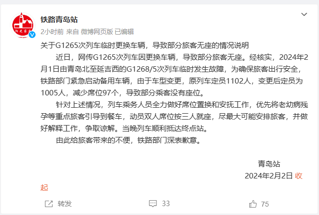 2月2日,@铁路青岛站 发布《关于G1265次列车临时更换车辆,导致部分旅客无座的情况说明》。