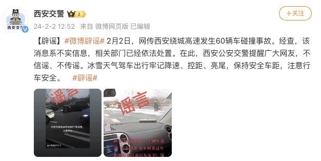 据央视网,据@西安交警 微博消息,2月2日,网传西安绕城高速发生60辆车碰撞事故。经查,该消息系不实信息,相关部门已经依法处置。在此,西安公安交警提醒广大网友,不信谣、不传谣。冰雪天气驾车出行牢记降速、控距、亮尾,保持安全车距,注意行车安全。