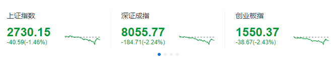 截至收盘,上证指数跌1.46%,报2730.15点;深证成指跌2.24%,报8055.77点;创业板指跌2.43%,报1550.37点。