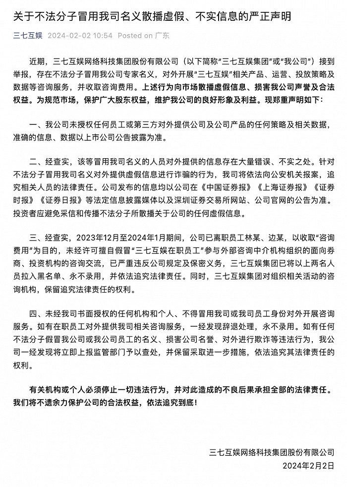 据界面新闻,2月2日,三七互娱发布声明称,近期公司接到举报,存在不法分子冒用公司专家名义,对外开展“三七互娱”相关产品、运营、投放策略及数据等咨询服务,并收取咨询费用。三七互娱表示,公司未授权任何员工或第三方对外提供公司及公司产品的任何策略及相关数据。经查实,2023年12月至2024年1月期间,公司已离职员工林某、边某,以收取“咨询费用”为目的,未经许可擅自假冒“三七互娱在职员工”参与外部咨询中介机构组织的面向券商、投资机构的咨询交流,已严重违反公司规定及保密义务,三七互娱集团已将以上两名人员拉入黑名单、永不录用,并依法追究法律责任。