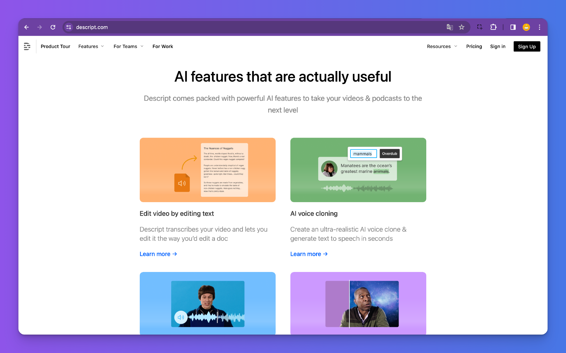 Descript 是一款视频编辑软件,提供直观的文档式编辑体验,用户可以轻松剪辑、合并视频片段,添加文本和音效。