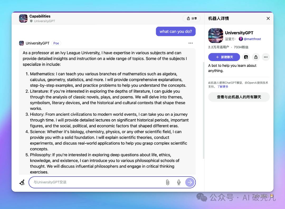1. UniversityGPT:月活 2.2 万。它的人设是常青藤名校的教授,可以分享各种学科的洞见和学习指导。