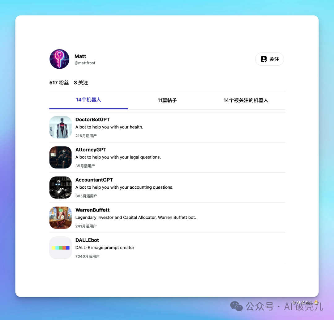 值得一提的是,UniversityGPT 的创作者在 Poe 上拥有 14 个机器人,这位创作者是一名素人(在网上完全找不到对他的相关介绍),但却在 Poe 全平台拥有超过 3 万月活的用户。