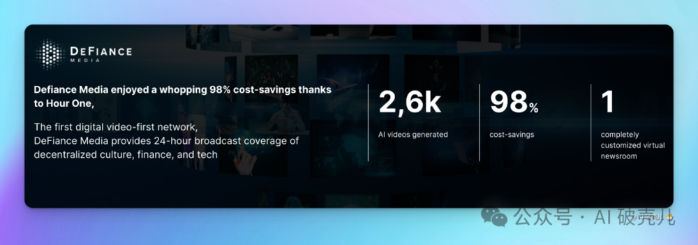 截至目前,DeFiance Media 已经通过自动化流程生成过 2600+ AI 视频,AI 主播实现了 24 小时连续播报,制作成本省了 98%。