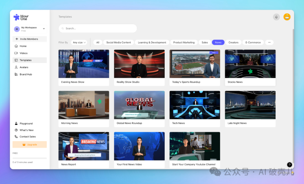 如果你是内容创作者,也想为自己打造一个 AI 主播,直接选择使用 Hour One 预置的“演播室”模版,以及从平台预置的 AI 主播库中选择自己中意的,导入视频文案,即可生成。