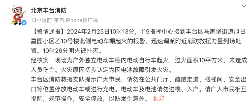 据北京丰台消防,2月25日晚,北京市丰台区消防支队发布警情通报:2024年2月25日10时13分,119指挥中心接到丰台区马家堡街道旭日嘉园小区乙10号楼北侧电动车棚起火的报警,迅速调派附近消防救援力量到场处置。10时26分明火被扑灭。经核实,现场为户外独立电动车棚内电动自行车起火,过火面积10平方米,未造成人员伤亡。火灾原因初步认定为因电池故障引发火灾。