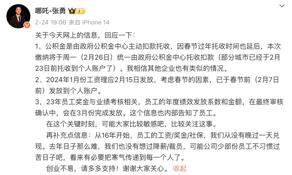 2月24日晚,哪吒汽车CEO张勇在微博发文,回应年终奖推迟发放传闻。张勇表示,2023年员工奖金与业绩考核相关,员工的年度绩效发放系数和金额,在最终审核确认中,会在3月份完成发放。