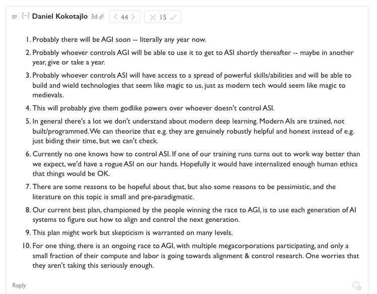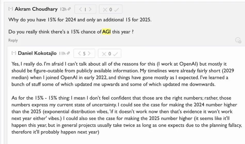 Daniel Kokotajlo 是 OpenAI Futures / Governance ( 未来 / 治理团队 )的研究人员,他致力于人工智能对社会和公众的影响研究,在 OpenAI 之前在长期风险研究中心 ( Center on Long-Term Risk )工作。他在最近的一个 Lesswrong ( 一个知识分子的科技媒体平台 )讨论中, 说自己相信有 15% 的几率通用人工智能( AGI ) 将在 2024 年到来, 如果没有实现的话,在 2025 年会有 30% 的可能性 AGI 到来。我好奇为什么他会这么乐观。