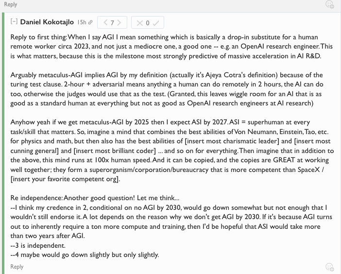 在这个回答之下,Daniel Kokotajlo 又向评论者解释了他对通用人工智能的定义: