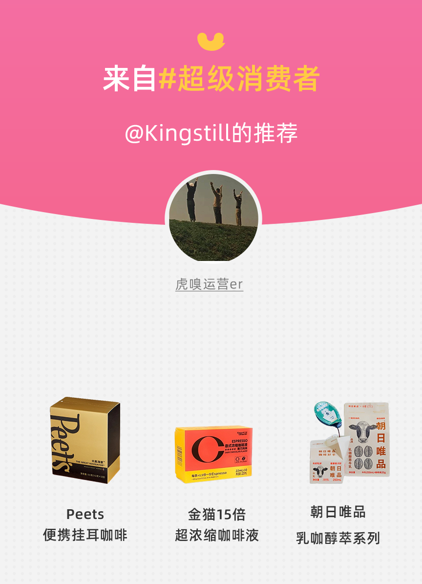 Kingstill:比较在意产品的品质和审美。比如peets的挂耳日期比较新鲜,保质期一年那种便携咖啡几乎没有咖啡的风味了。产品的包装设计/颜值我也蛮在意的,一方面是包装好看可以心情变好,另一方面,设计上有巧思也会提升我对品牌的印象分,会留意品牌有没有其他的好产品。