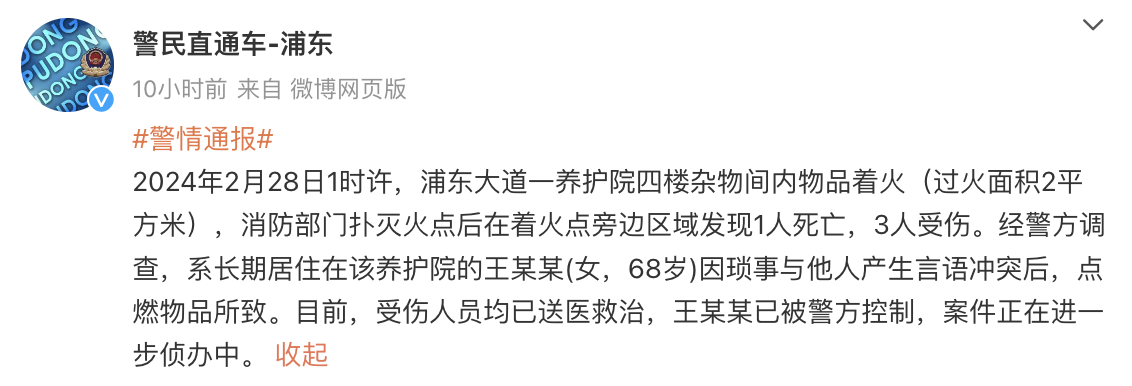 据警民直通车-浦东,2月28日1时许,浦东大道一养护院四楼杂物间内物品着火(过火面积2平方米),消防部门扑灭火点后在着火点旁边区域发现1人死亡,3人受伤。经警方调查,系长期居住在该养护院的王某某(女,68岁)因琐事与他人产生言语冲突后,点燃物品所致。目前,受伤人员均已送医救治,王某某已被警方控制,案件正在进一步侦办中。