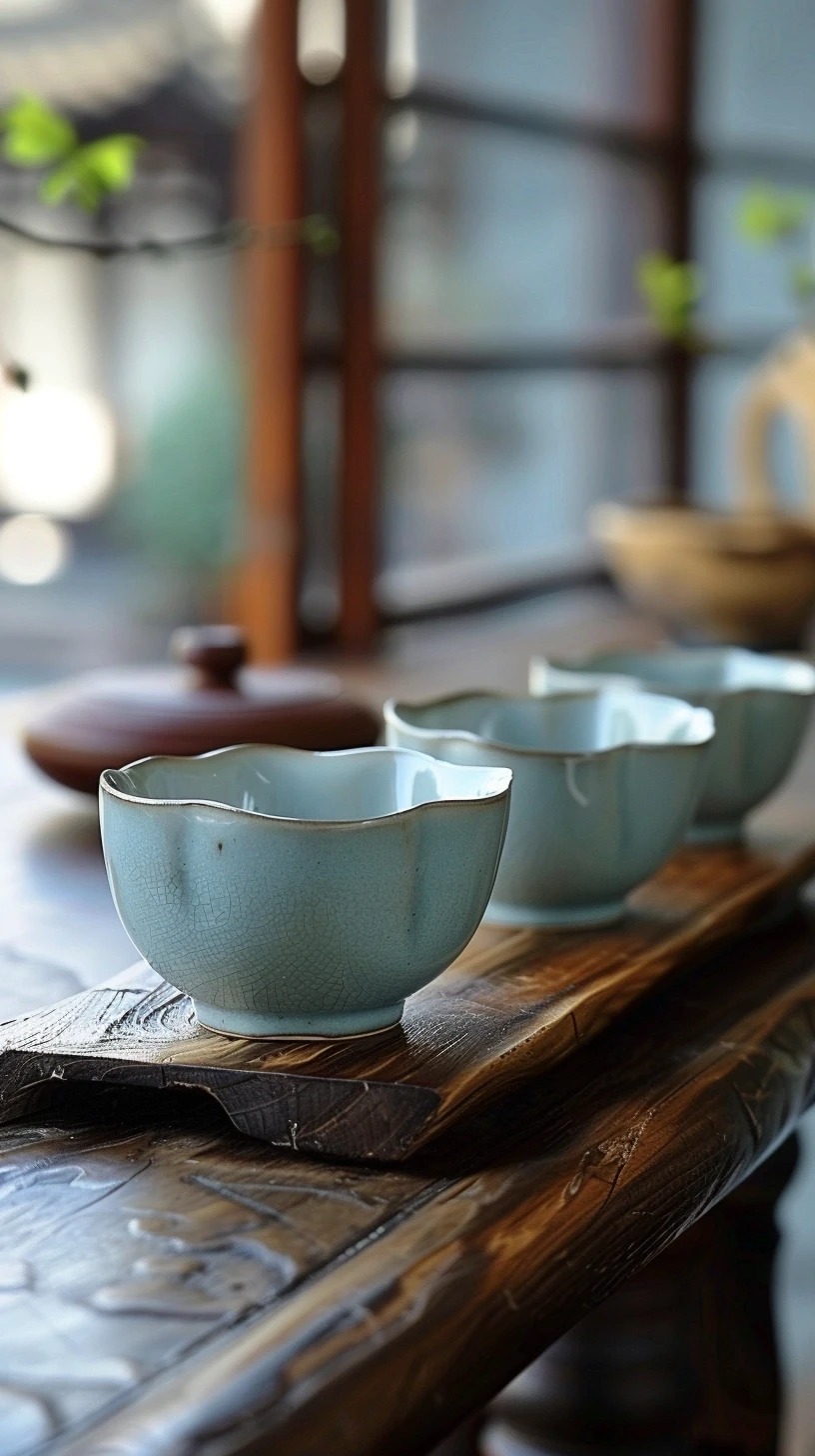 在柔和的光影下,一排精致的青瓷茶碗静静排列在古木茶桌上。每一只茶碗都以其裂纹釉面和温润的色泽讲述着手工艺的故事,静待着一场茶香盈盈的交流