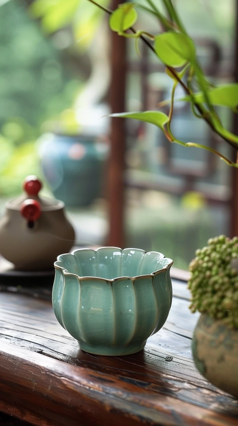 青瓷茶碗独占画面,它的边缘轮廓与倾斜的植物叶片和远处朦胧的茶壶相得益彰。它不仅是饮茶的容器,也是禅意生活的象征,提醒我们在忙碌的生活中寻找片刻宁静。