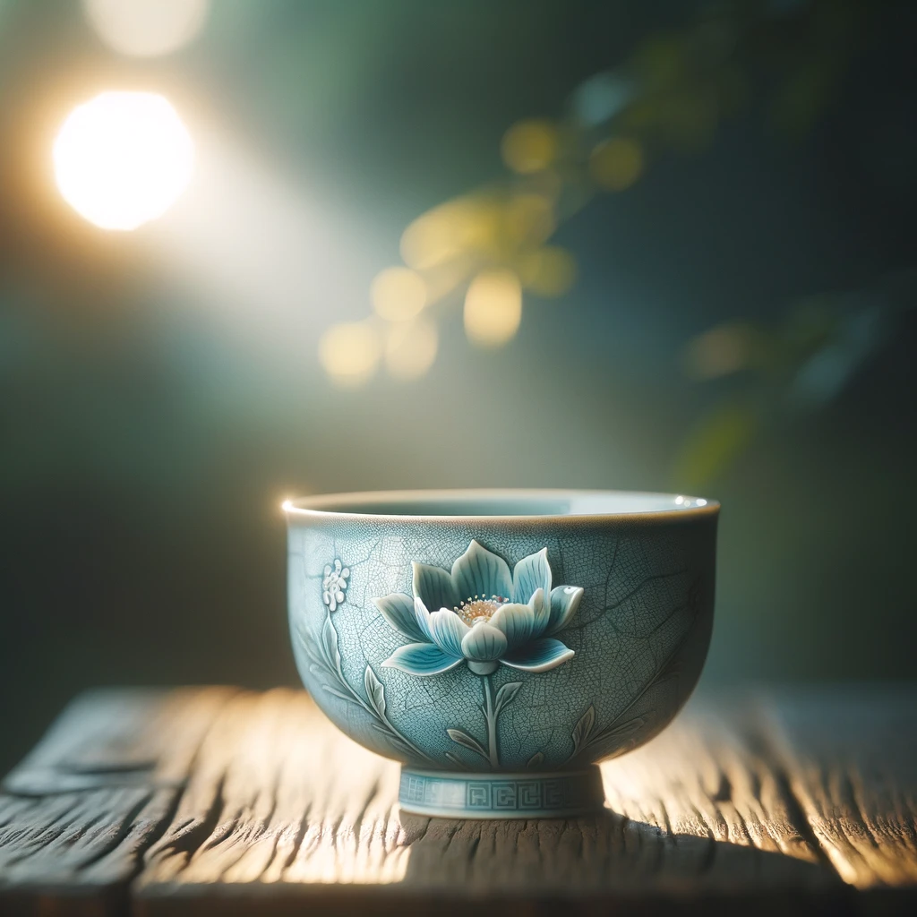 在柔和的光线与暖色调的背景中,一只精美的青瓷茶碗静置于木质台面上。碗上绘有一朵盛开的莲花,与细腻的裂纹釉面相映成趣,展现出东方美学的精粹。