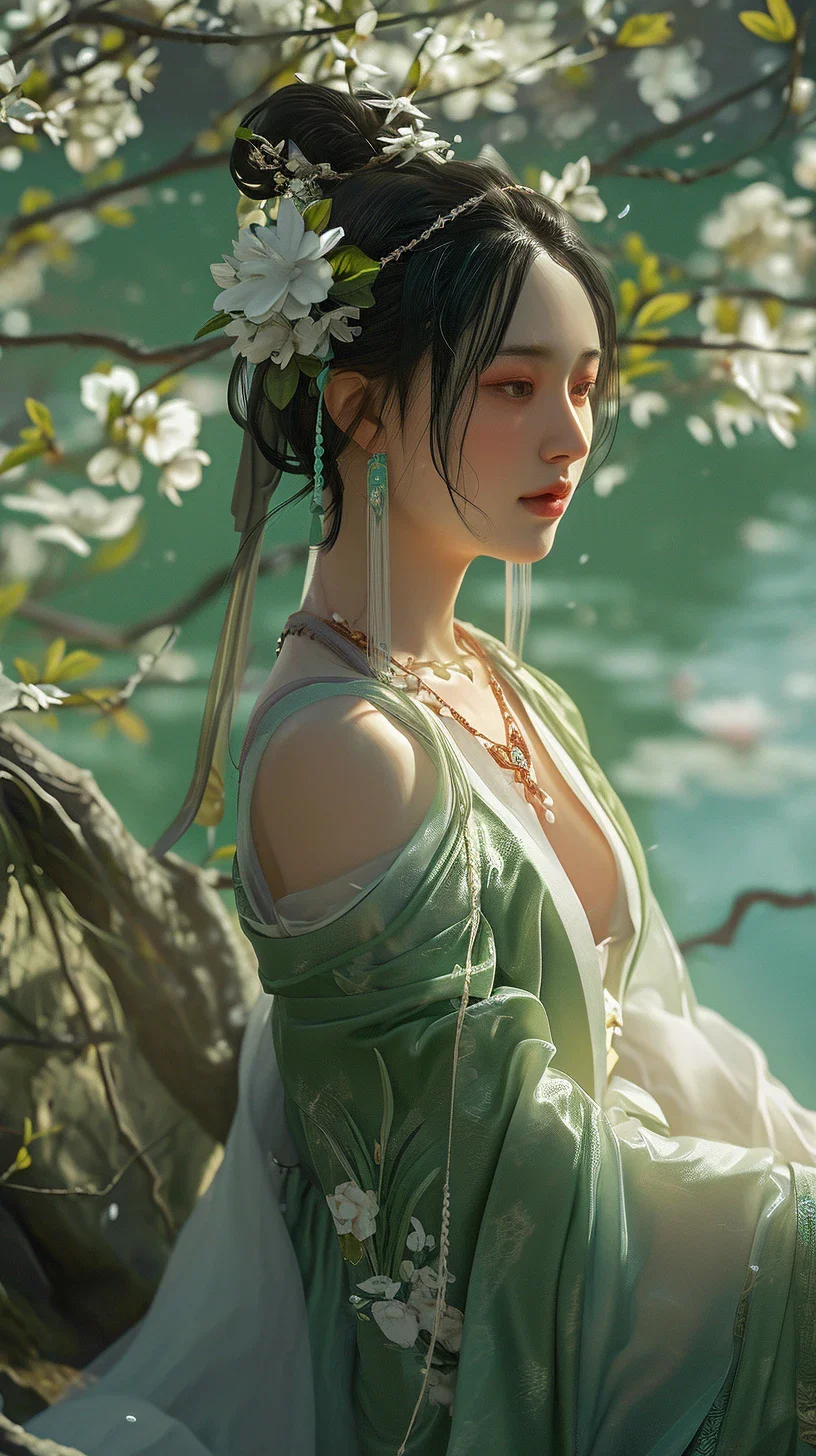 一位穿着传统服饰的女性,她身着一袭翠绿色服装,服饰细节精美,融合了花朵的元素。她的发饰中也插满了鲜花,与背后盛开的树相映成趣。
