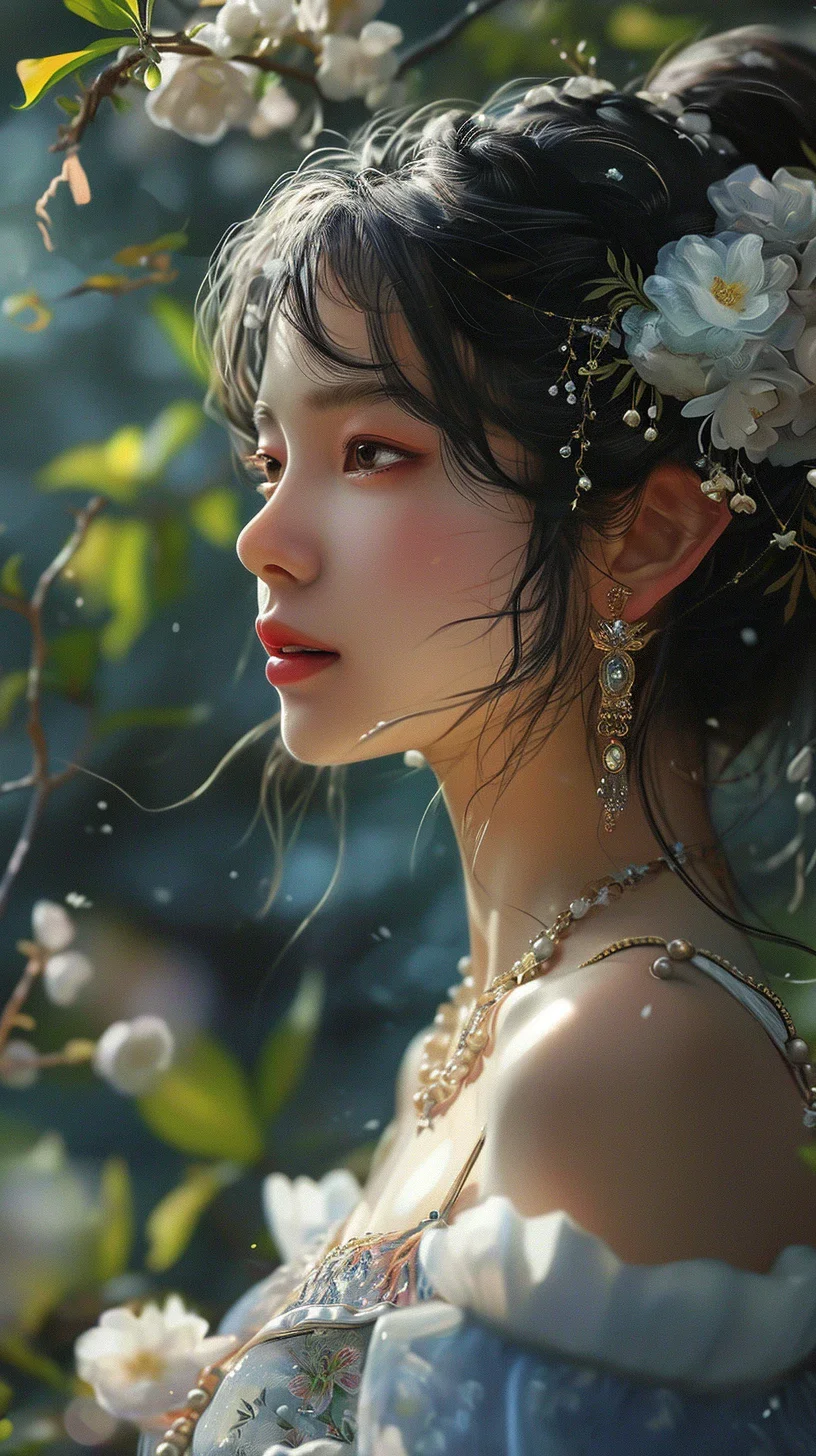 一位从古代画卷中走出的仙子,她的眼神深邃,带有一丝朦胧的梦幻色彩,仿佛在远方凝视。她的头发同样装饰着精致的花卉和珠宝,映衬着她的珠光宝气。身着装饰有精细花卉图案的服饰,静静地在花海中沉思