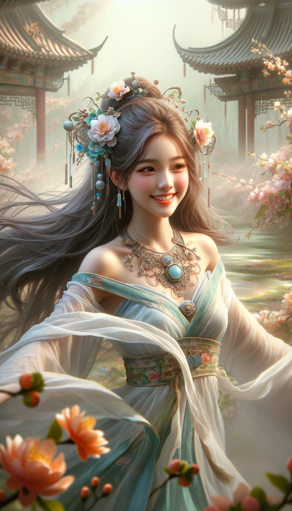 Prompt:Chinese girl wearing a necklace, inspired by Sim Sa jeong, Azure. Fine hair, flower princess, antique style artwork, fantasy aesthetics Guvez, nature goddess, mist, god of spring, 8K high-quality/detailed art, sweet smile, full body shot, spring scene, action shot, super realistic,