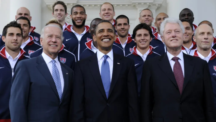 2010年5月27日,时任总统奥巴马(中)与时任副总统拜登(左)与前总统克林顿(右)在白宫与美国足球队合影。