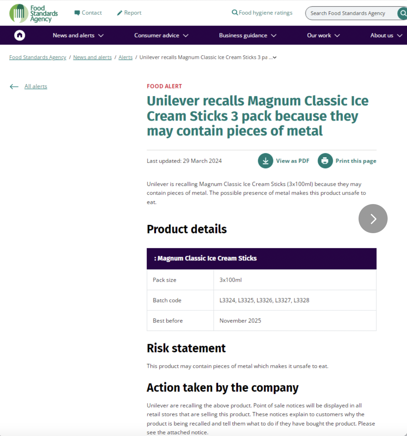 据南方新闻网,英国食品标准局官网3月29日发布消息称,因为可能含有金属碎片,联合利华(Unilever)正在召回多个生产批次的梦龙经典系列冰淇淋。英国食品标准局官网公布的信息显示,涉事梦龙冰淇淋的规格为3x100ml,保质期至2025年11月,批号分别为L3324、L3325、L3326、L3327和L3328。
