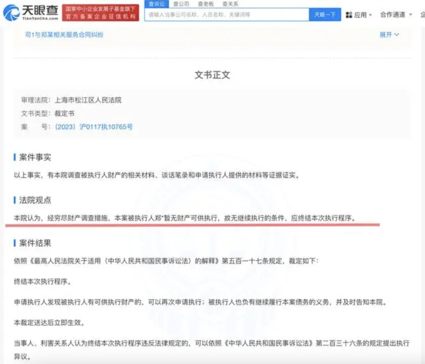 4月1日,澎湃新闻记者从天眼查获悉,该文书内容显示,法院认为,经穷尽财产调查措施,该案被执行人郑爽暂无财产可供执行,故无继续执行的条件,法院裁定:终结本次执行程序。