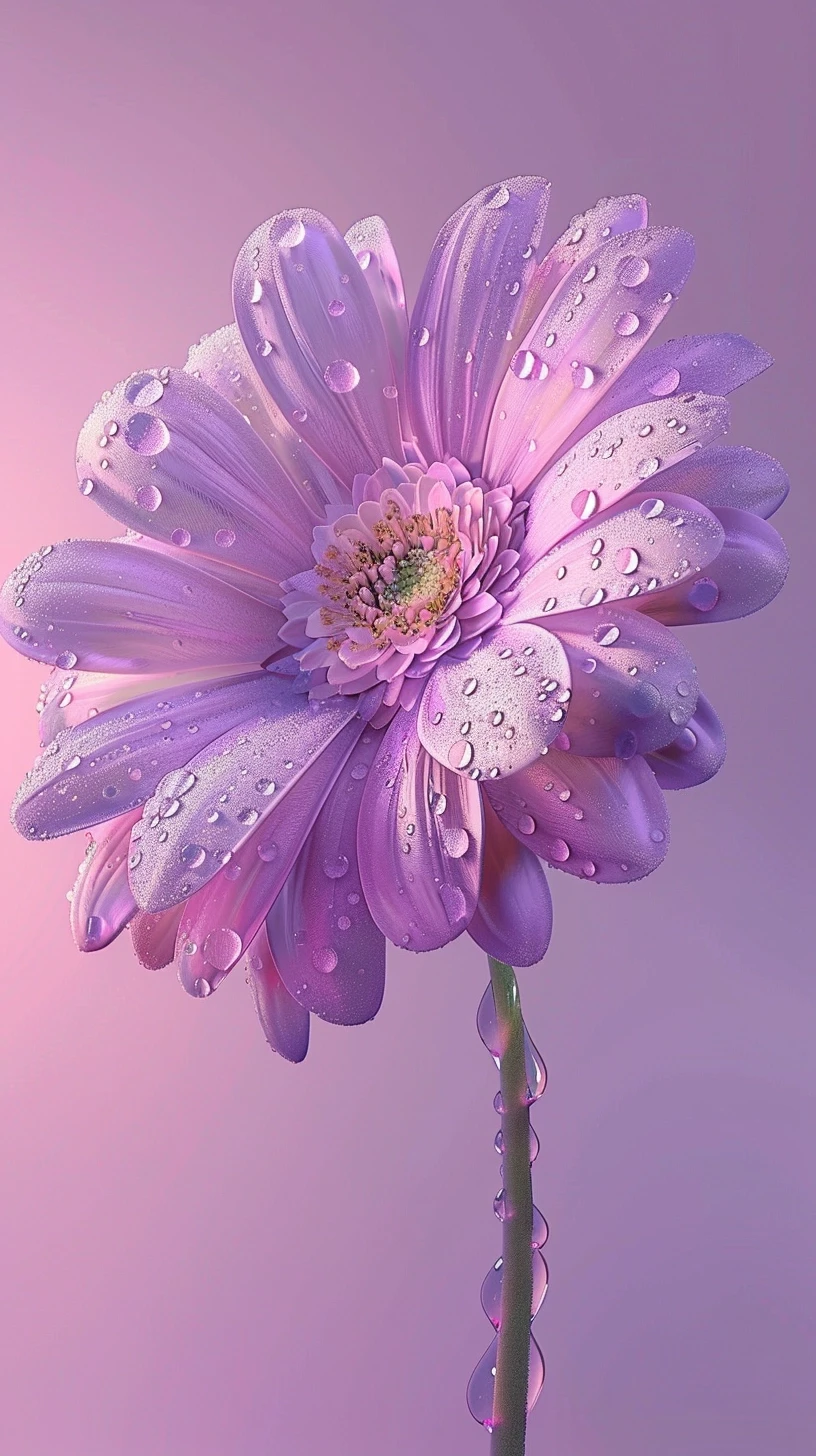 花朵背后是渐变的粉紫色背景,营造出一种温馨而梦幻的氛围。细长的花茎也被露珠装饰,闪烁着微光,整体呈现一种静谧而优雅的美感。