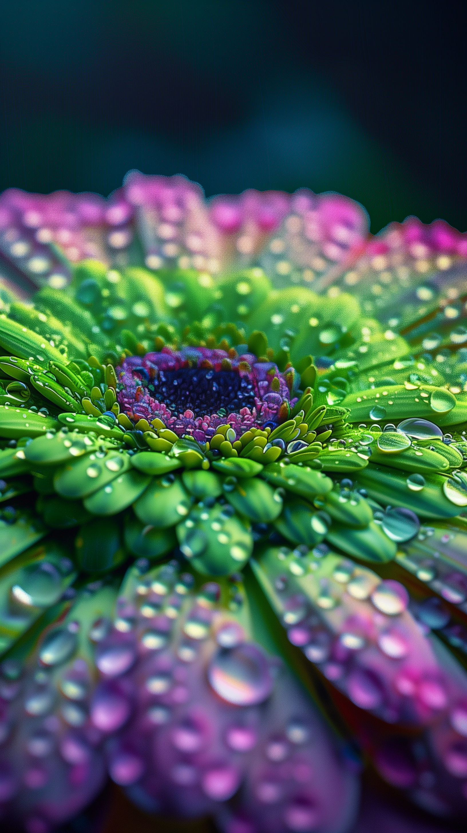 色彩斑斓的绿色和粉色雏菊,其上同样点缀着清新的露珠。这些露珠在柔和的灯光下显得格外熠熠生辉,为观者带来了一种清新的感受。整个场景宛如一个充满活力的自然奇观,令人感受到早晨新鲜露水的清新。