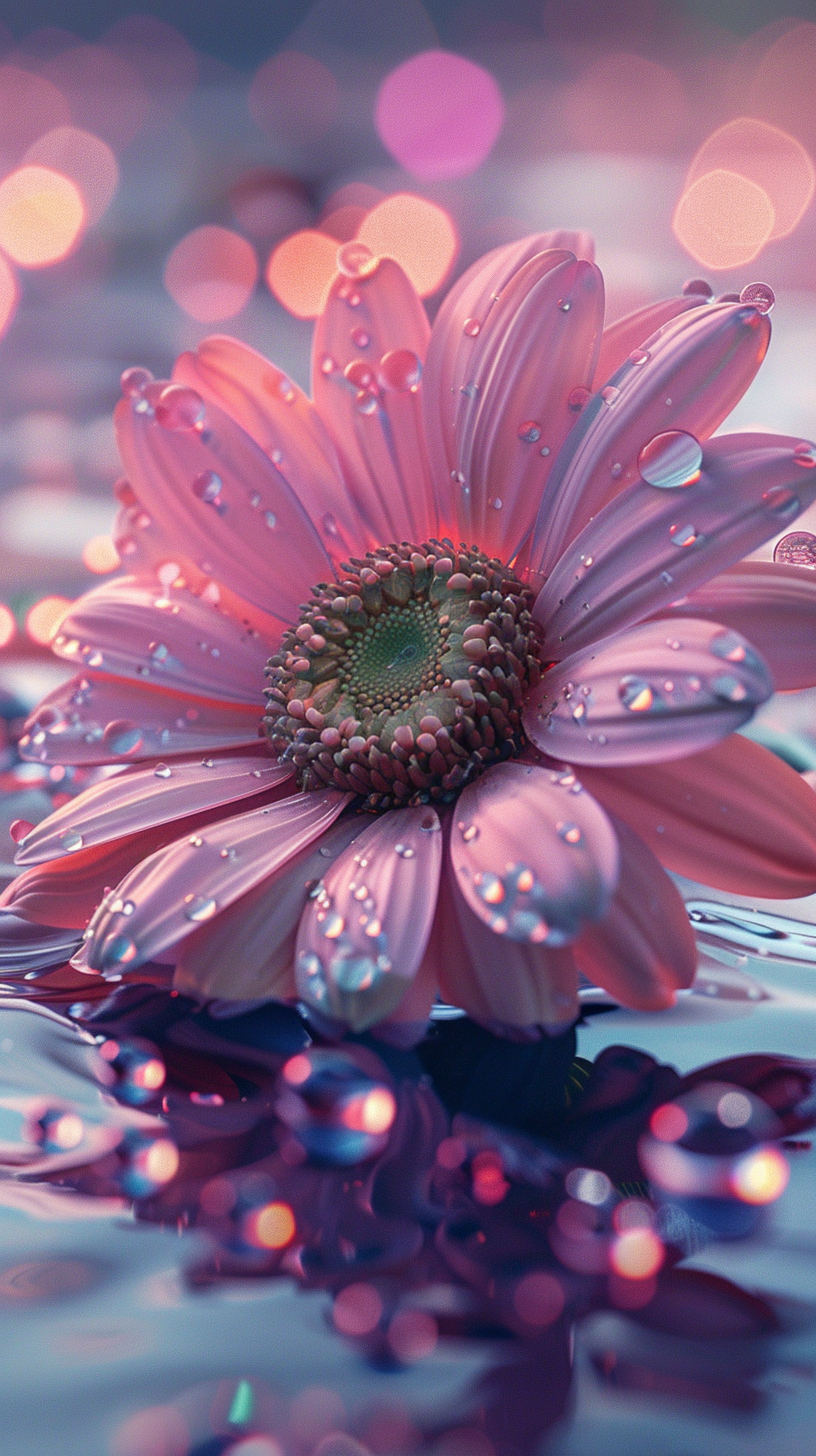 巨大的粉色雏菊,花瓣上沾满了晶莹的露珠。柔和的光辉和梦幻般的背景色调增添了一种温暖且浪漫的氛围。露水仿佛给花朵带来了生命,使之在光影的映衬下更加鲜活。